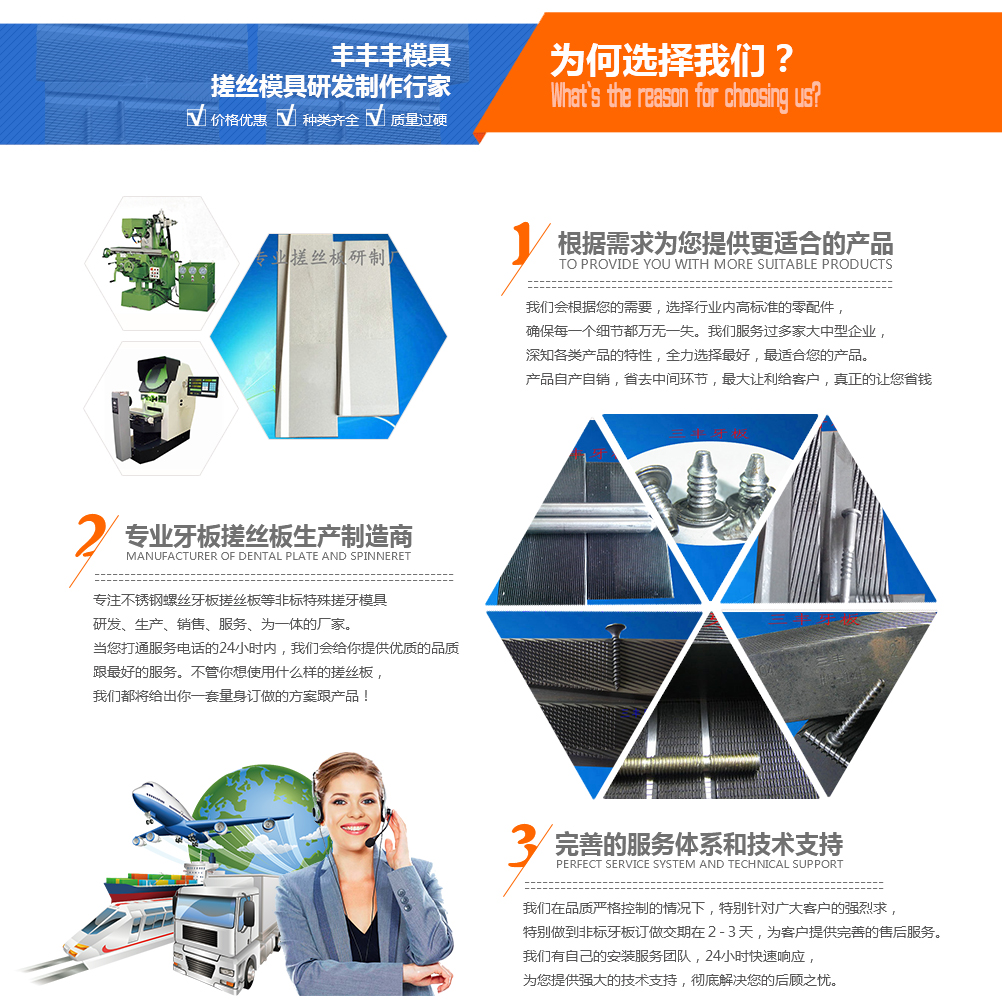 我們始終抱持著(zhù)勤、誠、信的原則,致力于螺絲牙板、搓絲板產(chǎn)品專(zhuān)業(yè)廠(chǎng)商。多年來(lái),由于全體同仁的勤奮、誠樸與使用客戶(hù)的支持與信任。造就三豐牙板品牌在業(yè)界樹(shù)立的良好形象,也建立了品質(zhì)保證的優(yōu)良信譽(yù)。勤、誠、信是三豐牙板全體同仁共同遵循的中心理念,更是我們服務(wù)客戶(hù)的宗旨。主營(yíng)產(chǎn)品:不銹鋼搓絲板,不銹鋼機絲倒角切平牙板,D/W雙線(xiàn)單出(ss)墻用細牙搓絲板,機絲束桿圓尾牙板,機絲帶圈位螺絲牙板,高低牙自攻牙板,機絲帶溝五溝牙板,不銹鋼扭花紋搓絲板,牛仔釘牙板,直齒搓花板等搓絲模具。產(chǎn)品可滿(mǎn)足國標(GB)、德標(DIN)、美標(ANSI)、日標(JIS)、國際標準(ISO)等各種國際通用標準,并能根據客戶(hù)實(shí)際要求,設計訂做各種特殊非標規格...
